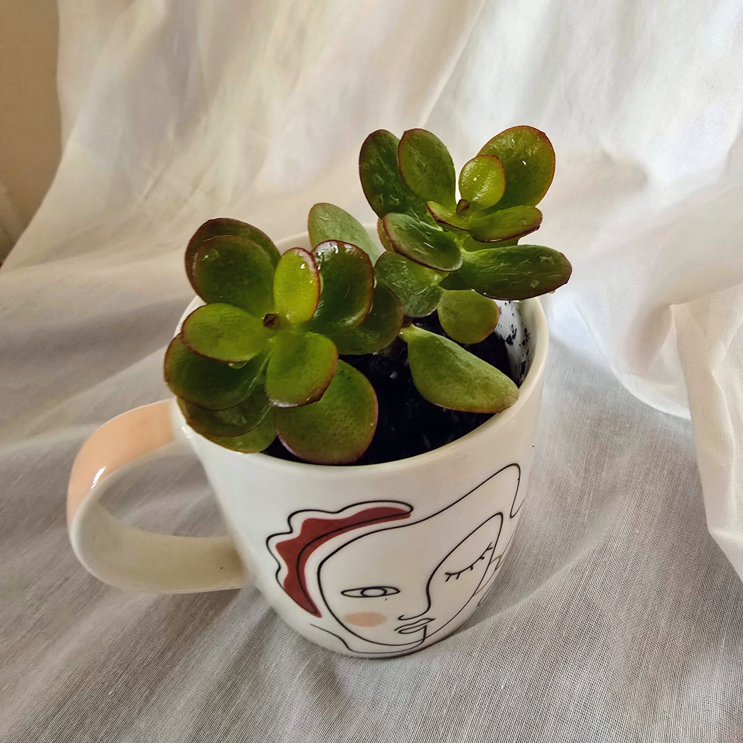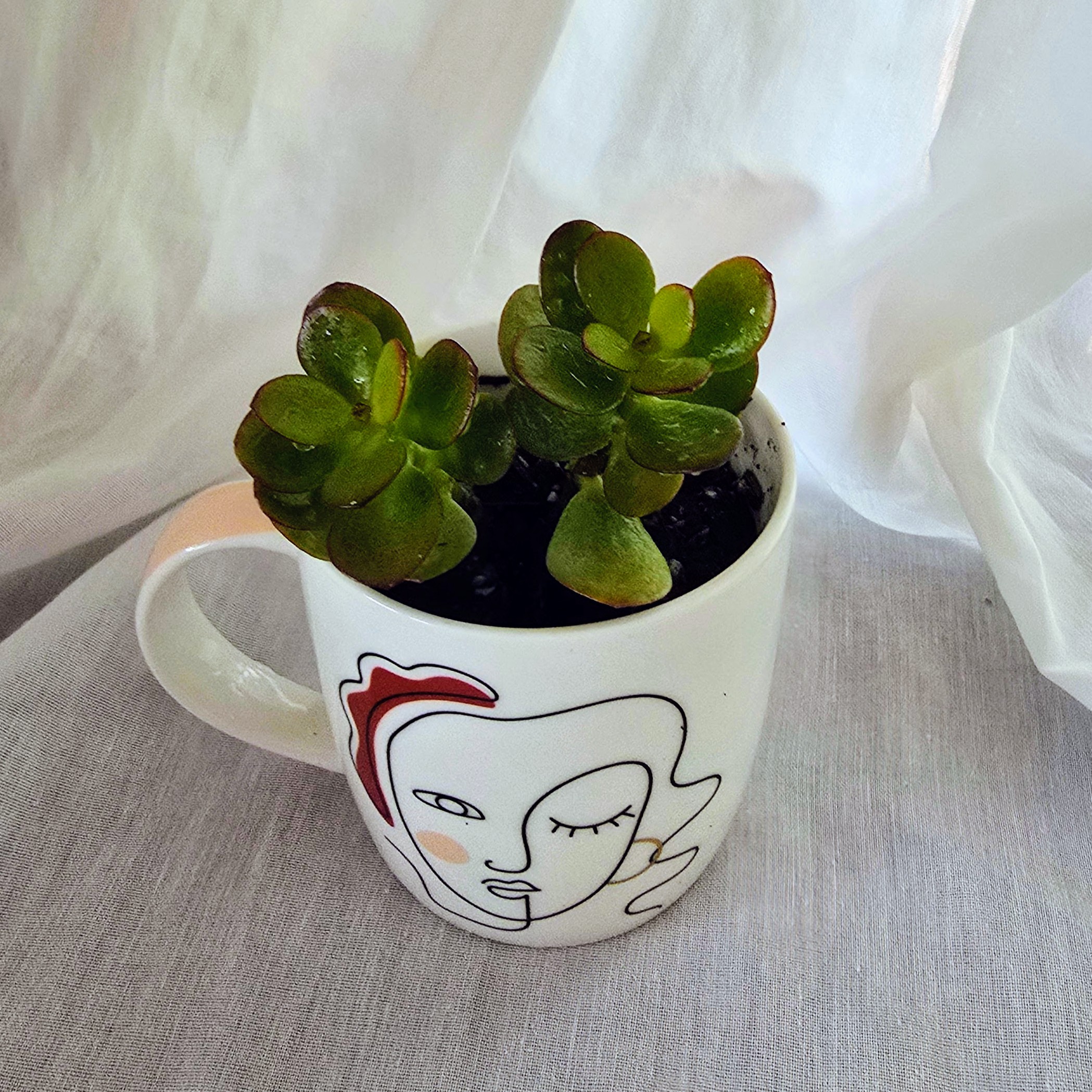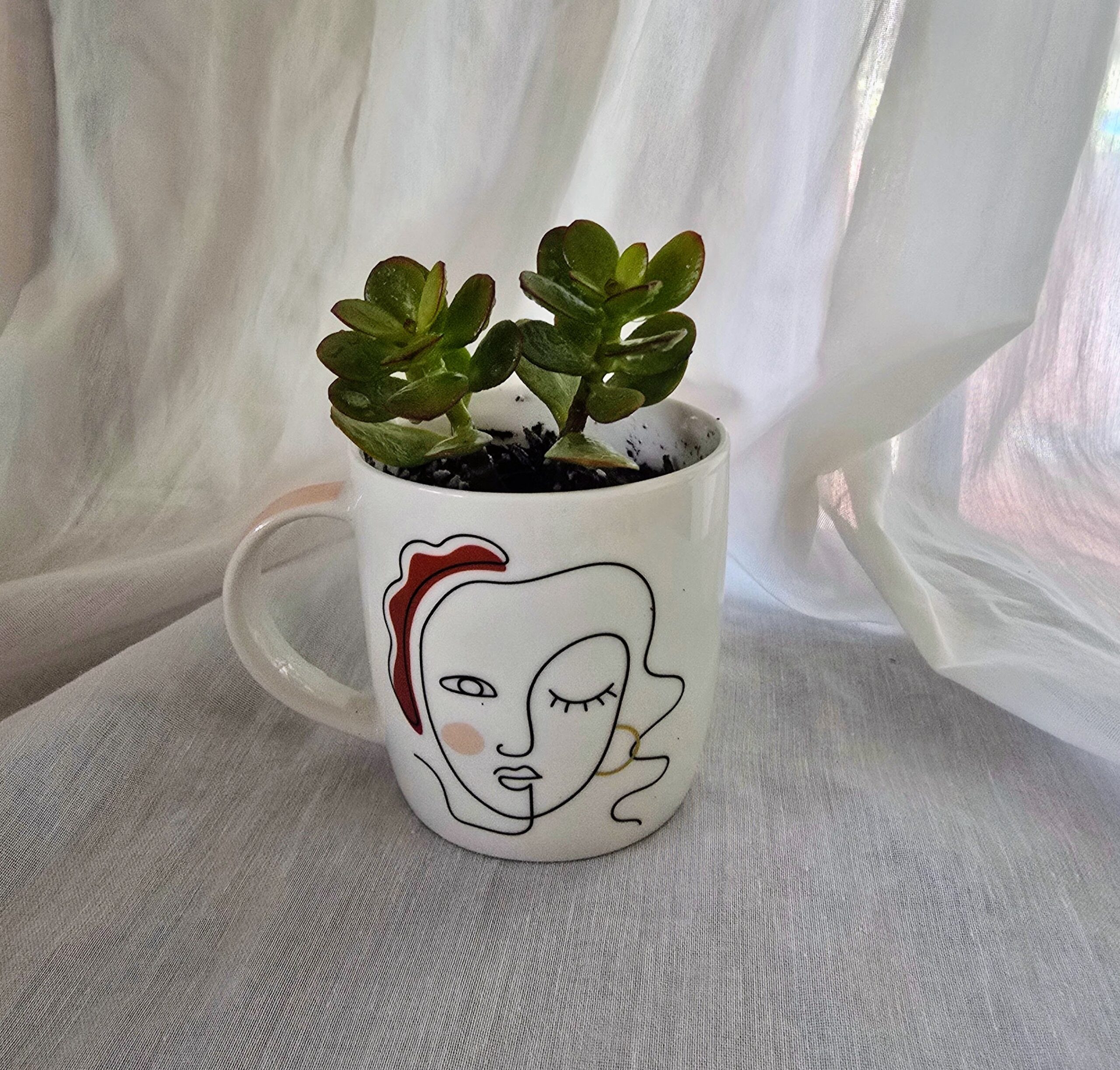 Our baby jade succulent is a symbol of prosperity, protection, and enduring love, thoughtfully planted in a ceramic mug adorned with minimalist face art. The mugโs abstract design adds a modern twist, making it perfect for gifting or personal rituals of calm and care.