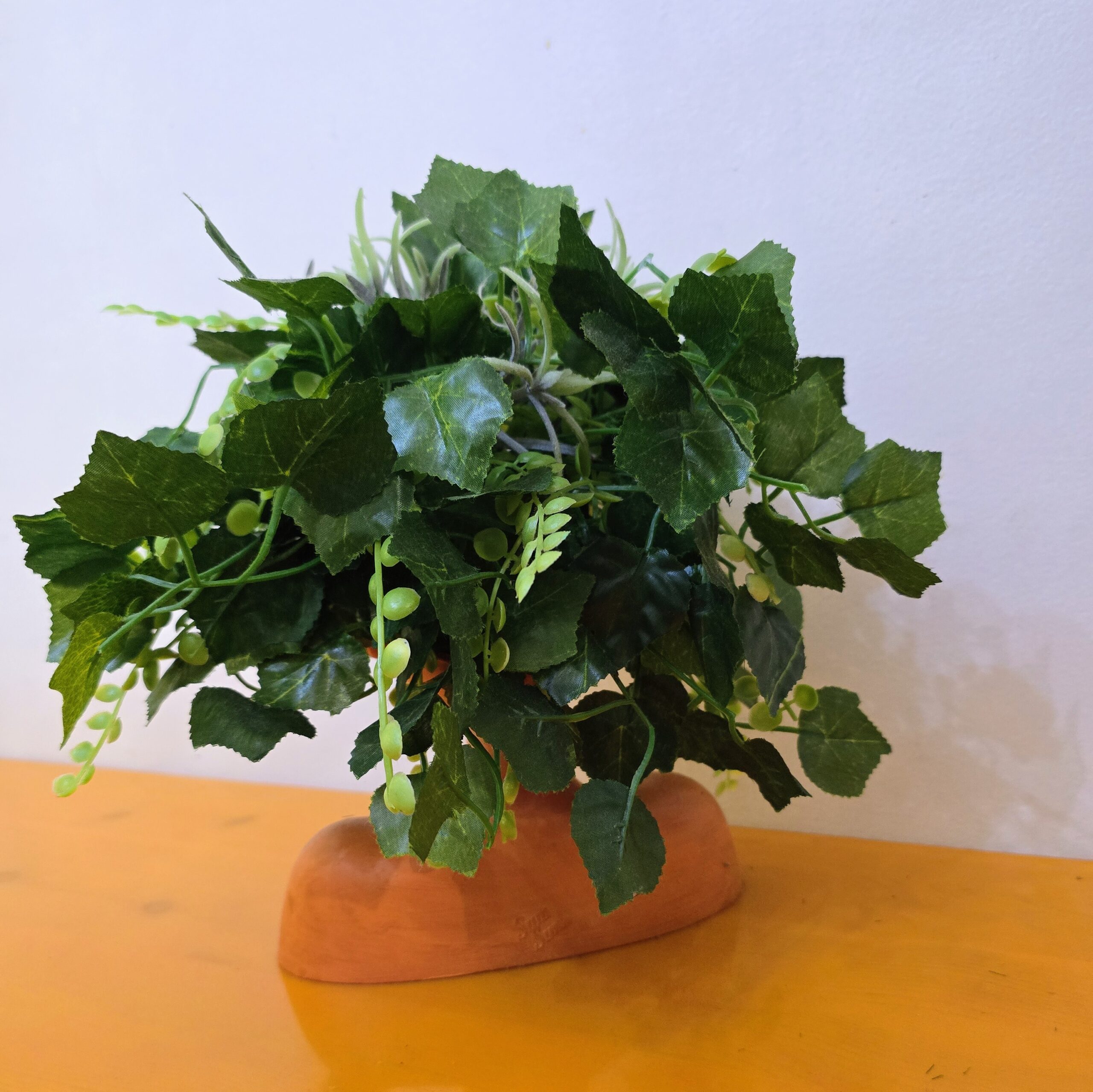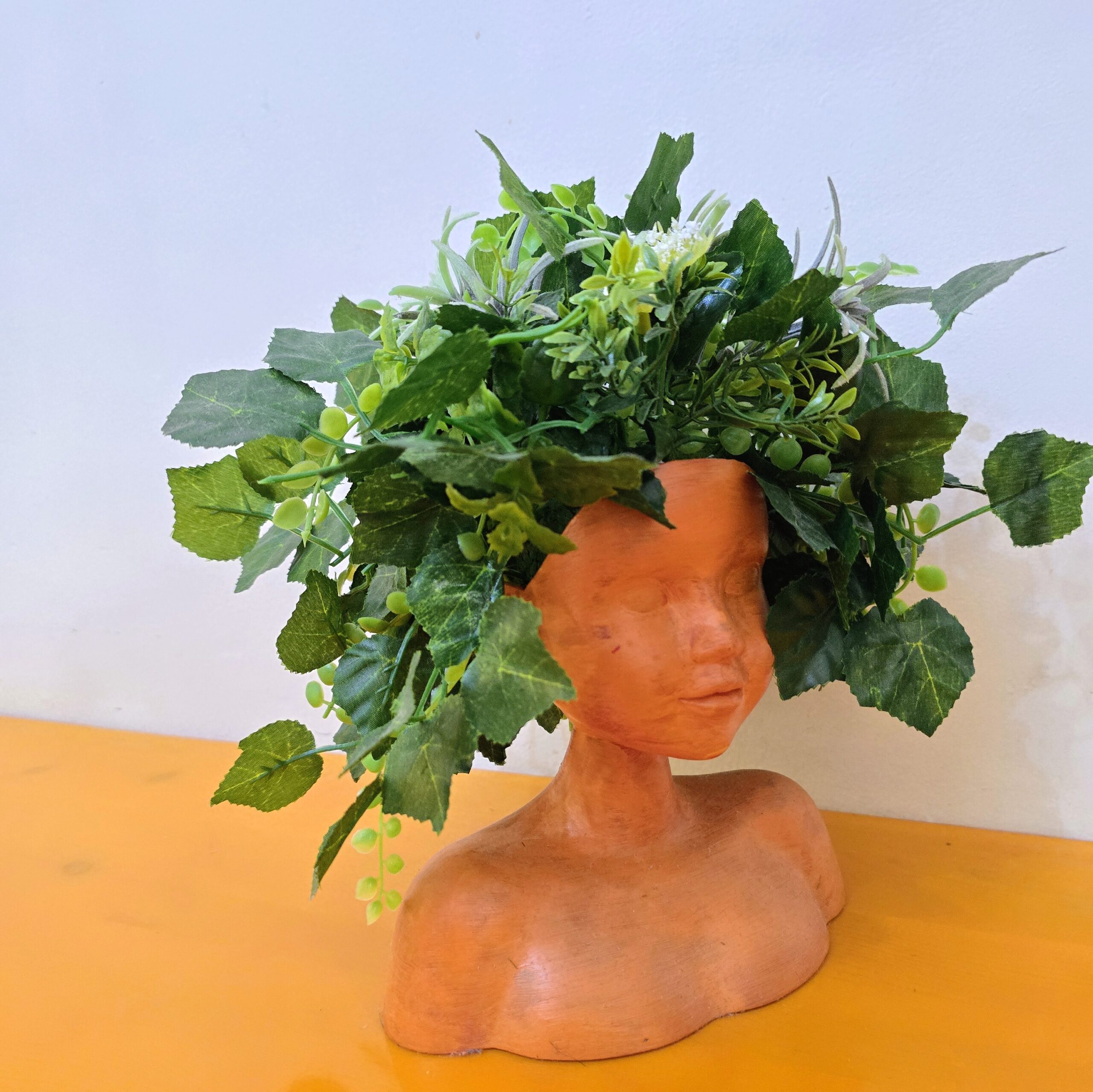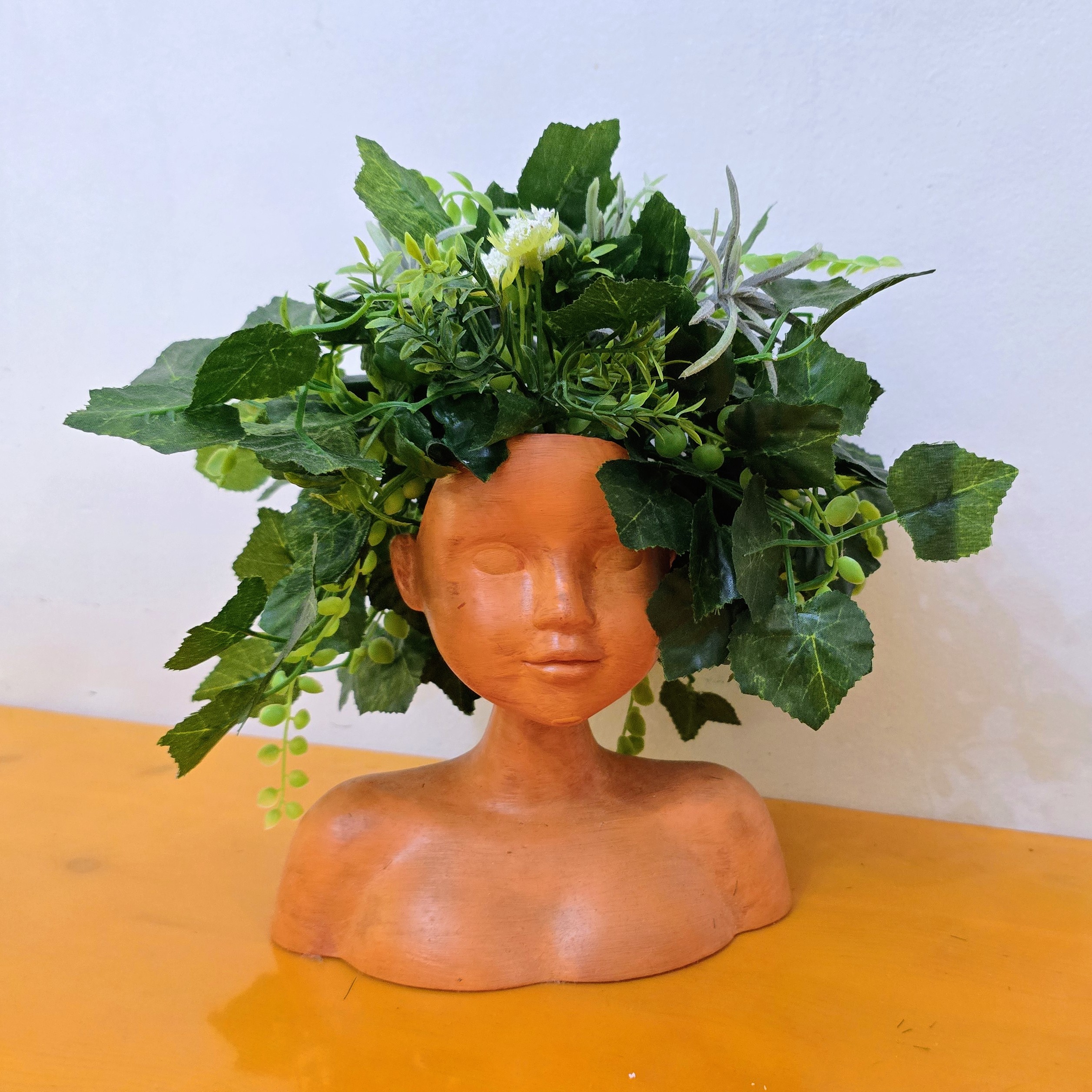 Our planter is a statement piece that blends human form with botanical flair. Painted in warm terracotta tones and crowned with lush faux foliage, it evokes a celebration of creativity, healing, and natureโs quiet wisdom.